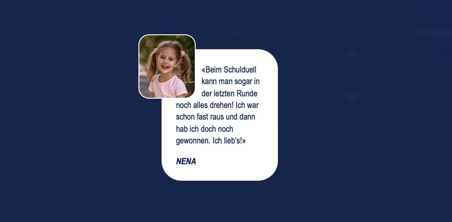 Hunderte Kinder schicken uns begeistert, wie sie das Schulduell spielen – wie sehr sie sich über den Schuldirektor ärgern, wie ihnen die „Resilienz“-Karte bei so manchem Rennen im Schulgebäude geholfen hat oder wie ihnen ein Super Zwischenzeugnis 2x Punkte zum Sieg verholfen hat. Die schönsten Kommentare haben wir hier für euch zusammengestellt.